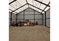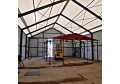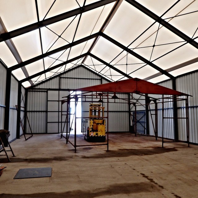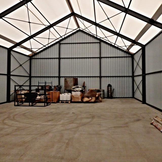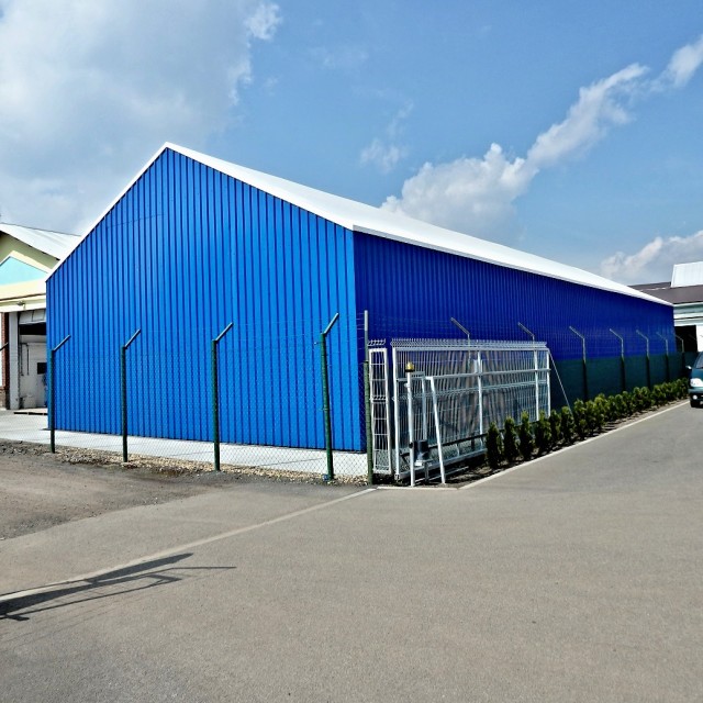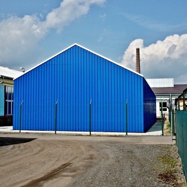 Na přání zákazníka jsme opláštili montovanou halu na stěnách pomocí trapézového plechu v modré barvě a střechu jsme opláštili textilií v bílé barvě v gramáži 900 g/m2. Výhoda této kombinaci spočívá v propustnosti světla do haly přes textilní opláštění.Parametry haly
