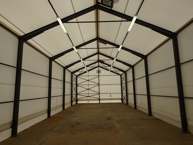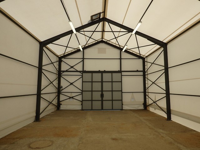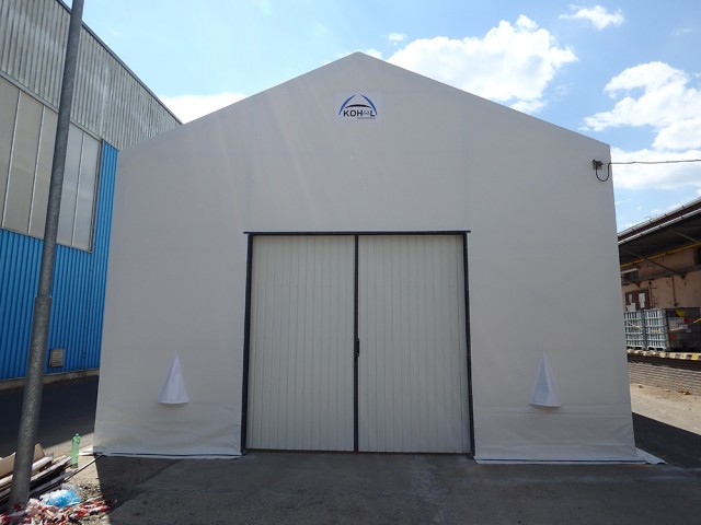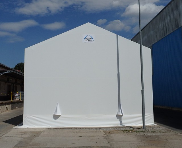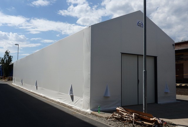 Plachtová hala o rozměrech 7 x 28 x 4,2 m sloužící ke skladování materiálu, s pojezdovými plechovými dvoukřídlovými vraty o rozměrech 3 x 3 m. Konstrukce haly se skládá ze sedlové střechy s plnostěnnými sloupy a plnostěnnými vazníky. Samočinné ventilační turbíny a odvětrávací stříšky v dolní části opláštění zajišťují větší cirkulaci vzduchu v hale.