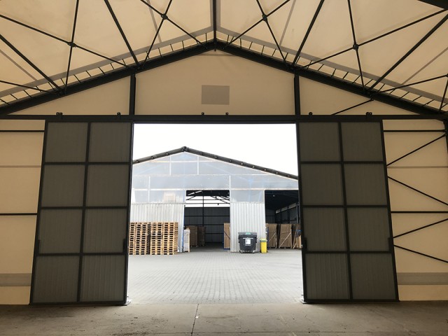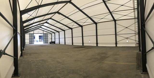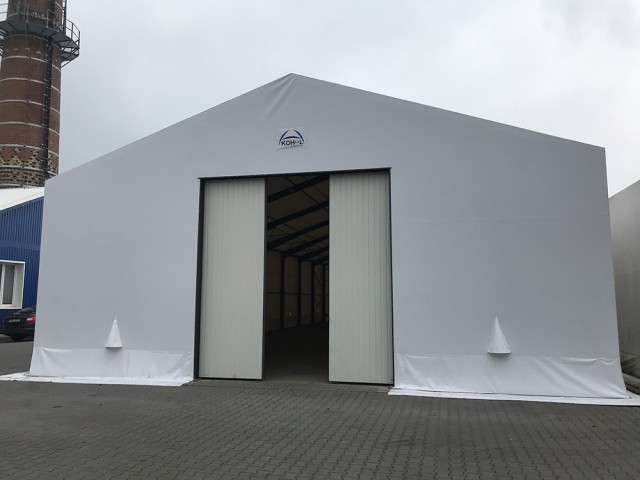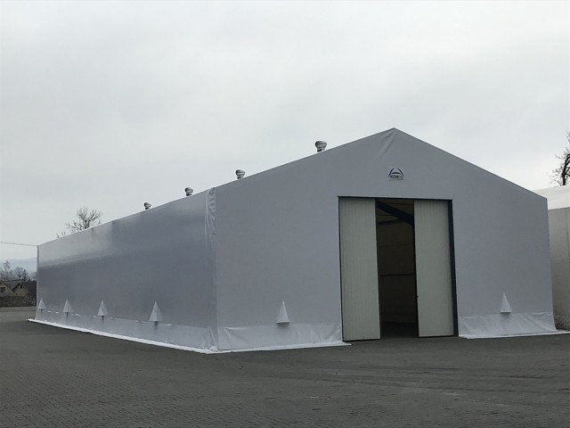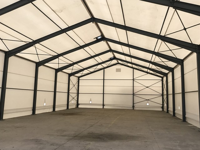 Plachtová hala se sedlovou střechou a bezpříhradovou konstrukcí sloužící k uskladnění materiálu. Montovaná hala obsahuje 1 ks pojezdových vrat.