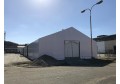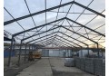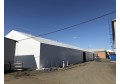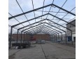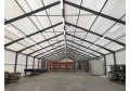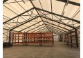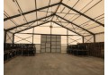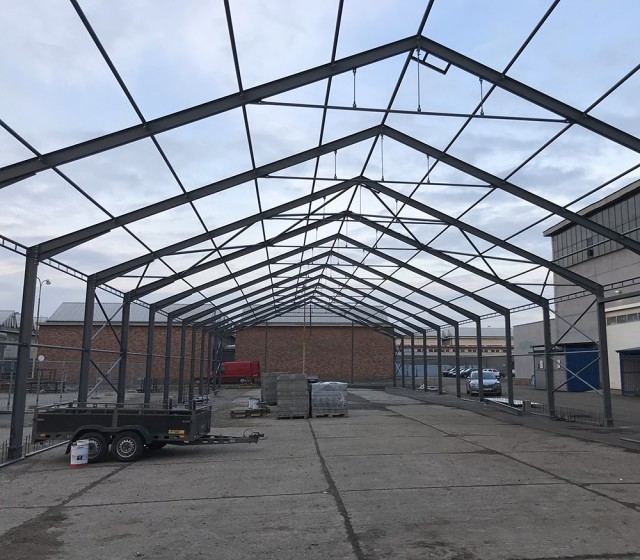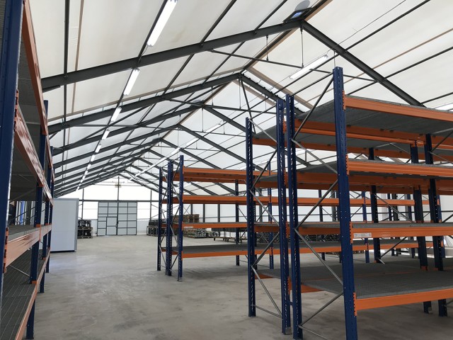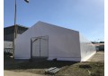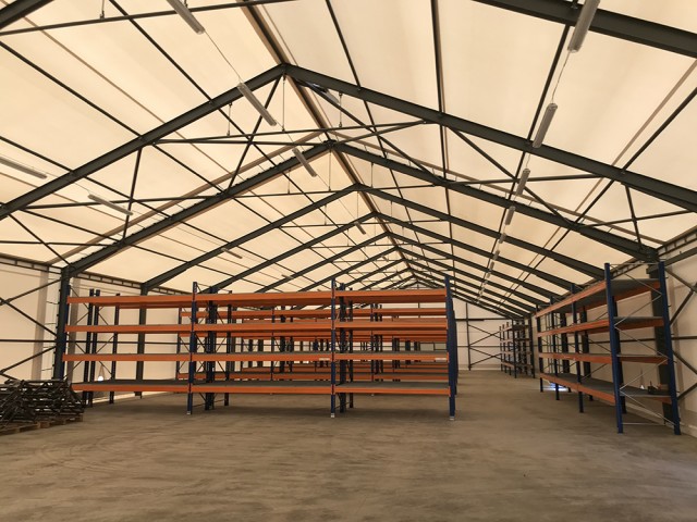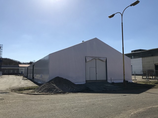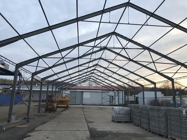 Plachtová hala se sedlovou střechou sloužící k uskladnění materiálu.